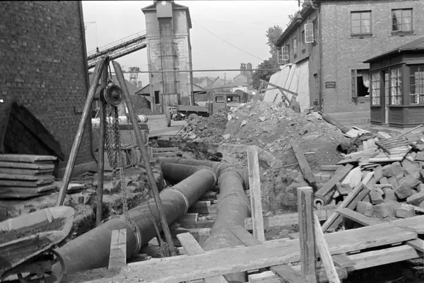 Legging av gassrør i grøfter på gassverkområdet ved Ankertorget. Løfte / Senkeanordning. Gatestein. Gassverkets teglsteinsbygning. Kokshaug med tårn i bakgrunnen. Byggestart for nytt retortanlegg (ovner der kull ble oppvarmet for å avgi gass) til Gassverket. (Anker studentboliger ligger på området idag.)