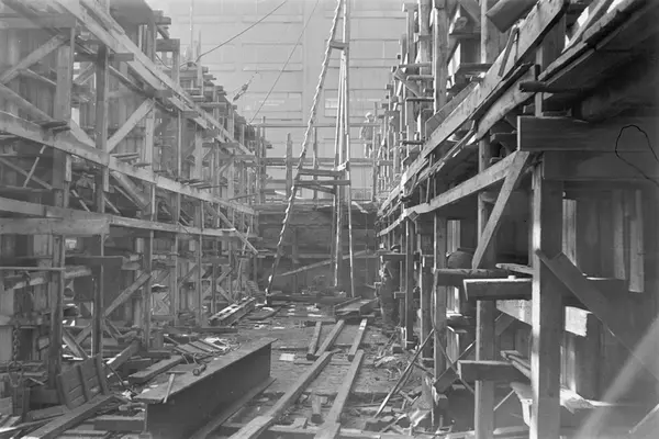 Byggeplass. Støping. Reisverk. Bygging av nytt retortanlegg (ovner der kull ble oppvarmet for å avgi gass) til Gassverket. Høyhus i Storgata 38 (Blå Korshuset) i bakgrunnen.