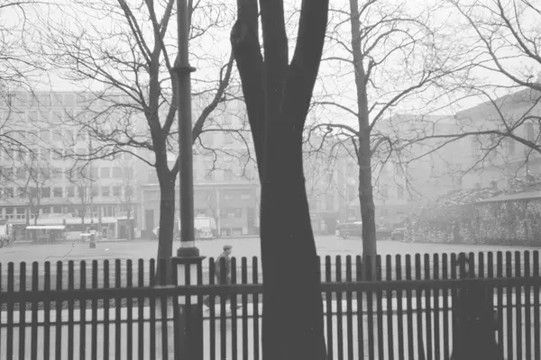 Tullinløkka med Nasjonalgalleriet til høyre. Plankegjerde langs Kristian IVs gate. Lager av fyringsved (sannsynligvis under krigen). Bebyggelse langs Kristian Augusts gate i bakgrunnen.