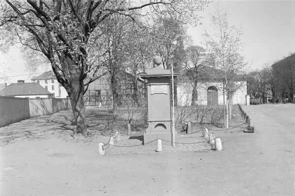 Fra Festningsplassen. Parkanlegg med monumentet over offiser og krigsråd Peder Blankenborg Prydz (leder av krigsskolen i andre halvdel av 1700-tallet). Hovedport fra Kirkegata i bakgrunnen.