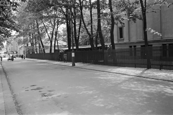 Frederiks gate mot Kristian IVs gate. Plankegjerde langs Universitetsområdet. "Professorboligen" og Kulturhistorisk museum ses i bakgrunnen, Domus Bibliotheca til høyre. Gatemiljø, motorsykkel med sidevogn. Sannsynligvis fra krigens dager.