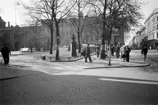 Folk venter på trikken ved stoppestedet i Kirkegata ved Stortorvet. Parkbenker. Brannvakten til venstre. Carl Ludvig Jacobsens portrettbyste i bronse av domkirkeorganisten og komponisten Ludvig Mathias Lindeman. Domkirkeparken.