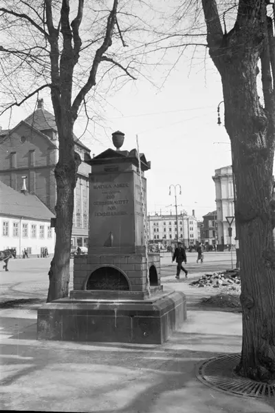Minnesmerke over Mathia Anker (Bernt Ankers hustru), laget av C.F. Stanley (avduket 1803). Reist i Paléhagen, senere flyttet til nordsiden av Oslo Bymuseum. Strandgata mot Østbanen. Paleet til venstre.