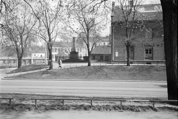 Storgata mot krysset Christian Krohgs gate. Krohgstøtten sykehus med legevakten. Krohgstøtten (minnesmerke med løve) til minne om jurist, statsråd og grunnlovsforsvarer Christian Krohg. (Avduket 17. mai 1833.) Bebyggelse langs Christian Krohgs gate i bakgrunnen.
