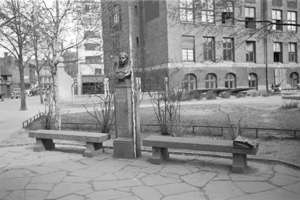 Kristinn Pjeturssons portrettbyste (avduket 1930) av sosialarbeider Olafia Johannsdottir i Stenersgata. Hjalp syke og fattige i Oslo. Sittebenker. Oslo Elementærtekniske skole (revet 1969) nærmest i bakgrunnen. (Kjøpesenteret Oslo City og Oslo Spektrum ligger idag på dette området.)