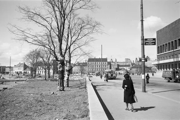 Rådhusplassen med Vestbanen og del av gamle Vika i bakgrunnen. Opparbeidelse av parkmessig anlegg nedenfor Rådhuset. Skilt viser vei til Akers Sparebank. Trafikkmiljø, spaserende.