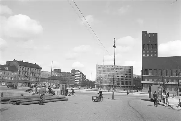 Vestre Rådhusplassen med deler av gamle Vika (langs Skolegata) og nybebyggelse i glass og betong (kontorbygg) i bakgrunnen. Gatemiljø, sykkelbud, kjerre, arbeidsvogn, telefonkiosk. Roald Amundsens gate (nåværende Olav Vs gate) innover i midten.