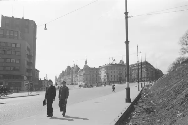 Drammensveien (nåværende Henrik Ibsens gate) opp langs Abelhaugen. Torstedgården til venstre, Victoria Terrasse ovenfor Ruseløkkveien i bakgrunnen. To menn i dress og hatt.