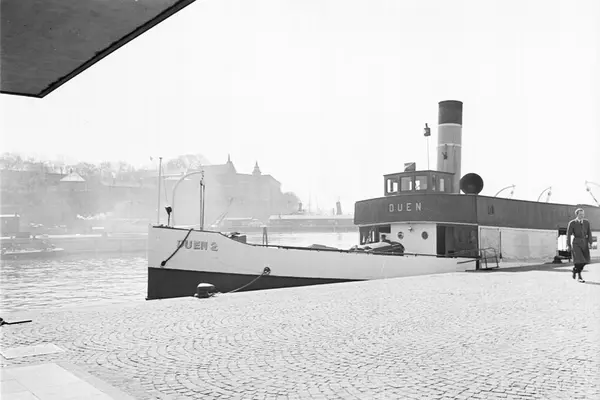 Rutebåten "Duen 2" ved kai. Duen gikk i rute mellom Oslo og Askerlandet for Dampskibsselskapet Asker, Røken og Hurum fra 1919 til 1952. Akershus festning og Akershuskaiene i bakgrunnen.