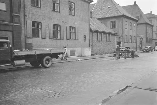 Rådhusgata med Garmanngården i nummer 7 til høyre. Rådhusgata 7B til venstre og 7C (lavbygningen) i midten. Lastebil, veiarveid i gata. Garmanngården var byens andre rådhus (1734-1843). Fredet, en av Oslos eldste bevarte bygninger (eldste bygningsdel fra 1625).