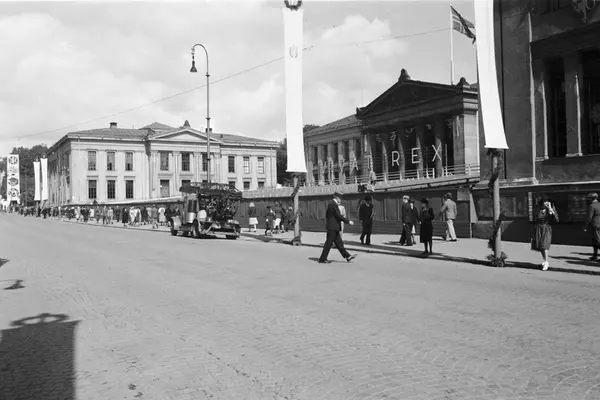 En pyntet Karl Johans gate ved Universitetet 7. juni 1945. Folkevandring mot Slottet. Teksten "VIVAT REX" (leve Kongen) opphengt på universitetsfasaden.