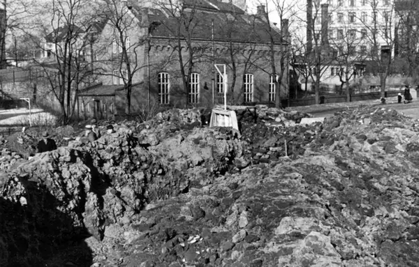 Bygging av dekningsgraver, beskyttelse mot flyangrep, bombeangrep. Fra Grønlands park ved Borggata. Fra album "Dekningsgraver i arbeide for Oslo kommune". Fotografert ved befaring 23. mars 1940.