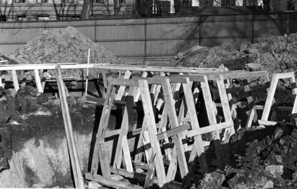 Bygging av dekningsgraver, beskyttelse mot flyangrep, bombeangrep. Reisverk. Fra Grønlands park. Fra album "Dekningsgraver i arbeide for Oslo kommune". Fotografert ved befaring 23. mars 1940.