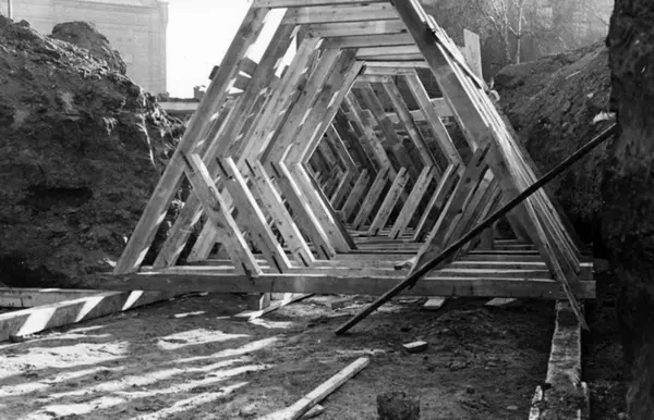 Bygging av dekningsgraver, beskyttelse mot flyangrep, bombeangrep. Reisverk. Fra album "Dekningsgraver i arbeide for Oslo kommune". Fotografert ved befaring 23. mars 1940.