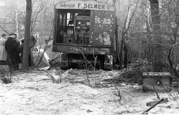 Bygging av dekningsgraver, beskyttelse mot flyangrep, bombeangrep. Gravemaskin fra Ingeniør F. Selmer. Fra album "Dekningsgraver i arbeide for Oslo kommune". Fotografert ved befaring 23. mars 1940.