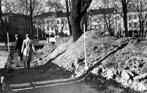 Bygging av dekningsgraver, beskyttelse mot flyangrep, bombeangrep. Gravearbeider på Olaf Ryes plass. Grüners gate i bakgrunnen. Fra album "Dekningsgraver i arbeide for Oslo kommune". Fotografert ved befaring 23. mars 1940.