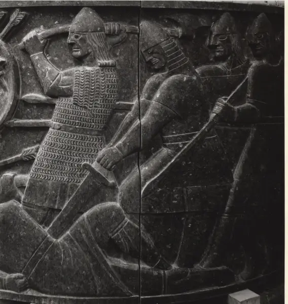 Slaget ved Svolder. Relieffet utgjorde en del av Eidsvollsøylen. Søylen er modellert av Wilhelm Rasmussen som et minnesmerke over medlemmene av riksforsamlingen på Eidsvoll 1814. Den ferdige søylen fikk aldri plass foran Stortinget som opprinnelig tenkt. Oppført i 1992 som Sagasøylen i Bøverdalen.