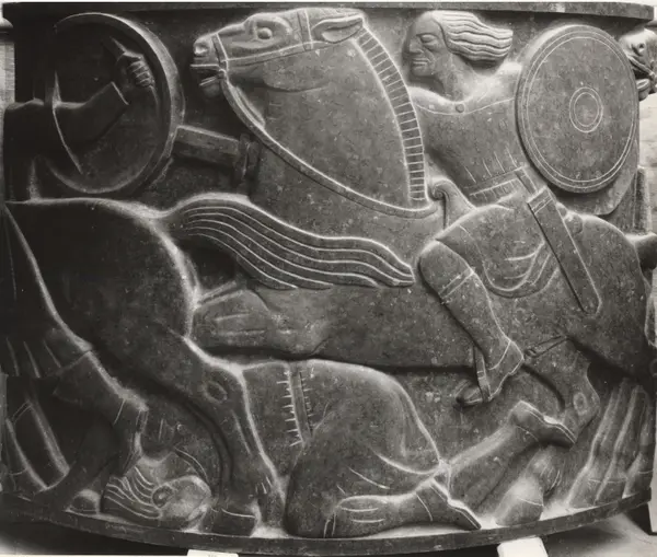 Åsgårsreien ferdig hugget. Relieffet utgjorde en del av Eidsvollsøylen. Søylen er modellert av Wilhelm Rasmussen som et minnesmerke over medlemmene av riksforsamlingen på Eidsvoll 1814. Den ferdige søylen fikk aldri plass foran Stortinget som opprinnelig tenkt. Oppført i 1992 som Sagasøylen i Bøverdalen.