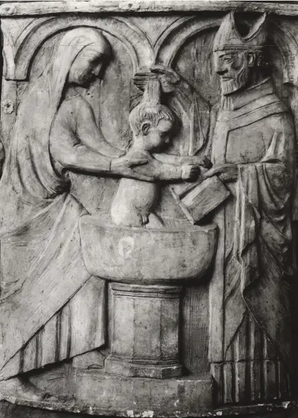 Gibsutkast av dåpsscene. Relieffet utgjorde en del av Eidsvollsøylen. Søylen er modellert av Wilhelm Rasmussen som et minnesmerke over medlemmene av riksforsamlingen på Eidsvoll 1814. Den ferdige søylen fikk aldri plass foran Stortinget som opprinnelig tenkt. Oppført i 1992 som Sagasøylen i Bøverdalen.