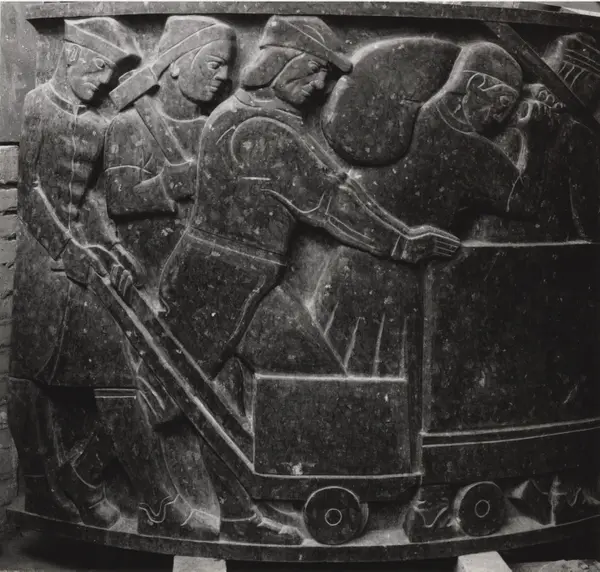 Kirkebygg ferdig hugget. Relieffet utgjorde en del av Eidsvollsøylen. Søylen er modellert av Wilhelm Rasmussen som et minnesmerke over medlemmene av riksforsamlingen på Eidsvoll 1814. Den ferdige søylen fikk aldri plass foran Stortinget som opprinnelig tenkt. Oppført i 1992 som Sagasøylen i Bøverdalen.