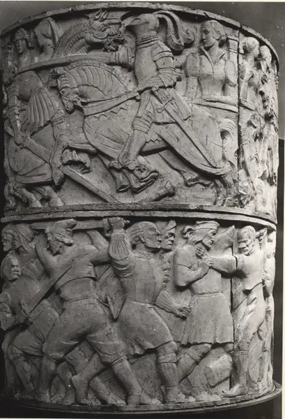 Gibsmodell av middelalderturnering. Relieffet utgjorde en del av Eidsvollsøylen. Søylen er modellert av Wilhelm Rasmussen som et minnesmerke over medlemmene av riksforsamlingen på Eidsvoll 1814. Den ferdige søylen fikk aldri plass foran Stortinget som opprinnelig tenkt. Oppført i 1992 som Sagasøylen i Bøverdalen.
