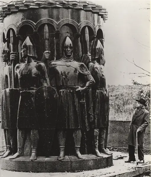Kunsteren Wilhelm Rasmussen sammen med nederste del av søylen, høvdinrekken, montert ved Rasmussens hjem på Syverstadkollen i Nesbru/Holmen i Asker. Foto fra rundt 1960. Eidsvollsøylen er modellert som et minnesmerke over medlemmene av riksforsamlingen på Eidsvoll 1814. Den ferdige søylen fikk aldri plass foran Stortinget som opprinnelig tenkt. Oppført i 1992 som Sagasøylen i Bøverdalen.