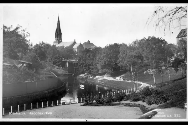 Gamle Ankerbrua sett fra øst. Steinbrua sto ferdig i 1926. Fortøyde båter langs Akerselva. Parkanlegg ved Søndre gate. Stolpegjerde langs gangveien. Jacob kirke.