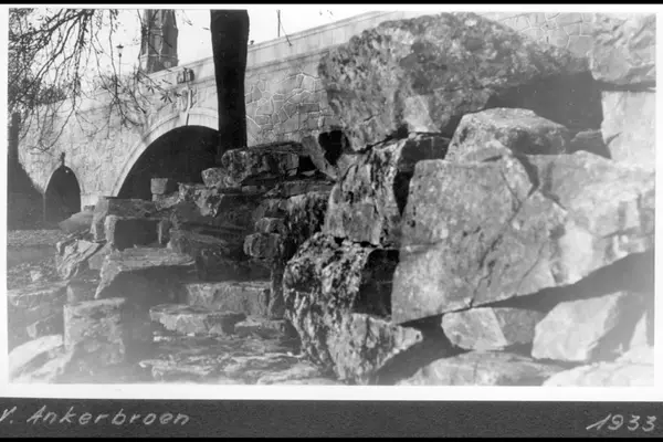 Brua og Akerselva. Bildet tatt fra østre side av elva/bruaJakobkirkens tårn i bakgrunnen. Steinhaugen i front av bildet ble brukt til å belegge elveskråningene med flate naturstein for å så i mot skiftende vannføring og til stein,-blomsterbed.