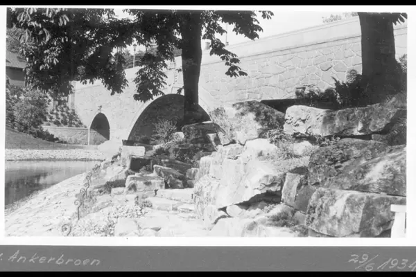Akerselva med steinlagte elvebredder. Ferdig parkanlegg med nybeplantet stein,-blomsterbed på nedsiden av brua.Naturstein til steinlegging av elvebredden og blomster beddene, i forgunnen av bildet. Bildet tatt 29 juni