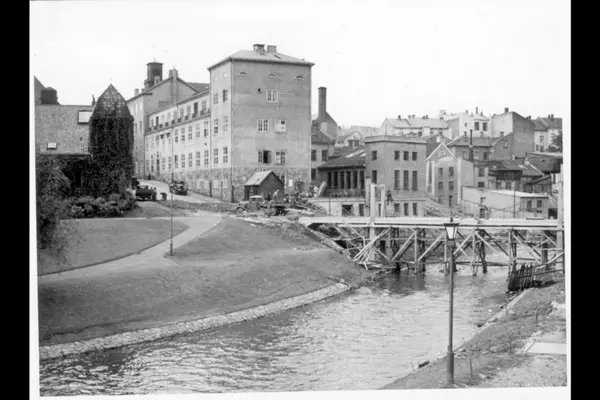 Akerselva. Bildet tatt fra østre elvebredd, mellom Øvre og Nedre gate og Ankerbrua. Parkbelte på vestre elvebredd, med turveier mellom Oslo yrkesskole, Elvebakken videregående skole, oppført 1937-38 (nå Elvebakken skole) som ses midt i bildet og arealet rundt Jakobkirken. Ny gangbru over elva fra Nedre gate til Østre Elvebakke, ferdigstilt 1937. Bildet sansynligvis tatt samme år. Håndverks- og industribygninger langs elva.
