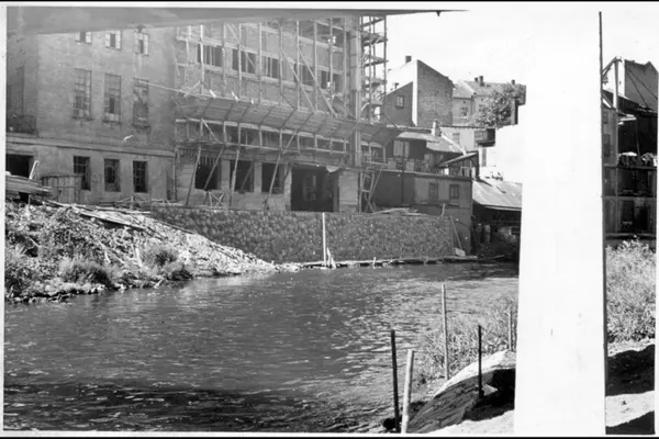 Byggearbeider, stillaser, bygninger tett ved Akerselvas vestside, ( Kristiania Fag- og Forskole for Håndverk og industri, oppført 1937-38 (nå Elvebakken skole). Bildet tatt under gangbrua som går over elva fra Nedre gate til Østre Elvebakke.
