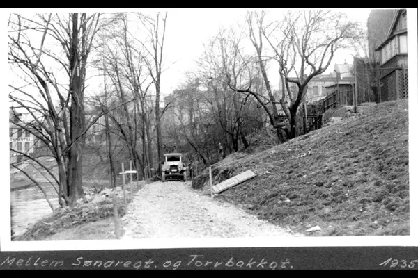 Opparbeidelse til parkanlegg langs Akerselvas nord- østre bredd. Lastebil med parkarbeidere i arbeid med planering og oppmåling av turvei langs elva. I bakgrunnen og til høyre i bildet ses den gamle trehus-bebyggelsen kalt Ny York og murgårdene melom Torvbakkgata og Søndre gate. Industribygget i venstre billedkant huset Kristiania Kunst og Metal - Støperi. Øvre gate til høyre.