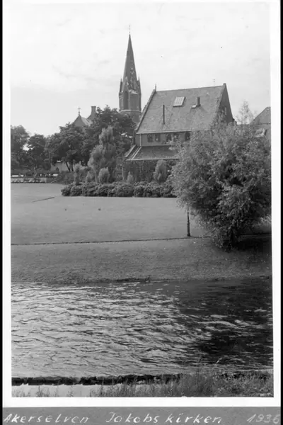 Parken mellom Jakob kirke og Oslos eldste transformatorstasjon ned mot Akerselva. Gangvei og belysning. Sittebenker på steinterrassen utenfor kirken. Kirken ferdigbygget og innviet i desember 1892.