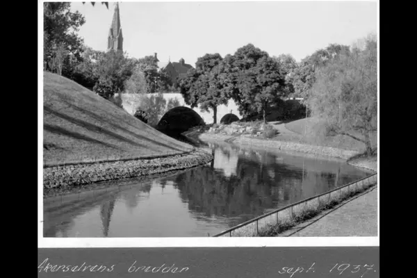 Parkanlegg med turvei og gjerde langs Akerselva. Belagt med naturstein langs elvebredden. Ankerbrua med Jakobskirken i bakgrunnen. Biledet tatt i september.