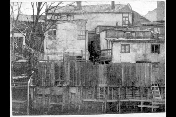 Den gamle bebyggelsen langs Akerselva med skur, rønner, små industri og verksteder. Plankegjerde og trapper ned til brygge for fortøyning av båter. Lakkegata vis a vis Fjerdingen.