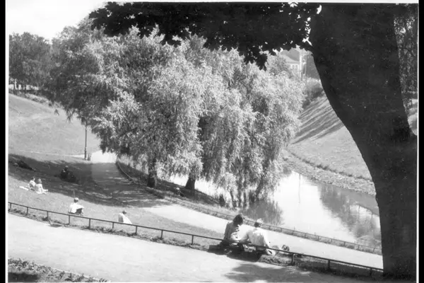 Sommeridyll ved Akerselva. Grøntområde med trær og beplantniger. Gangveier med belysning og gjerde. Mennesker sittende langs parkbeltet ved elva. Parkbelte sør for Nybrua.