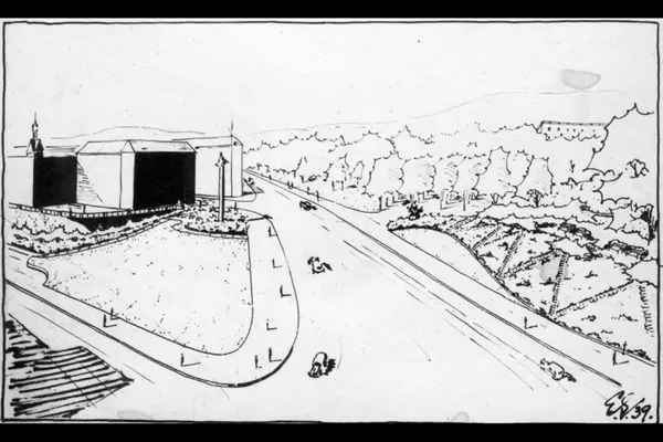 Plantegning fra 1939. Drammensveien, nåværende Henrik Ibsens gate, med Abelhaugen, Slottsparken og det Konglige slott til høyre i bildet. Ruseløkkveien og Triangelplassen, nåværende 7. juni-plass til venstre.