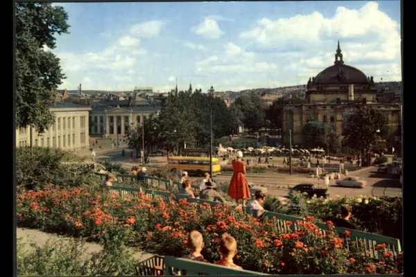 Fargebilde (1950/60) med utsikt fra Abelhaugen mot øst. Blomsterbed og sittebenker fylt med mennesker. Universitetsbygningene ved Karl Johans gate til venstre. Studenterlunden/Theaterhagen med Pernille uteservering. Nationaltheatret og nåværende Johanne Dybwads plass med nedgang til Nationaltheatret stasjon. Frederiks gate og Stortingsgata med biler, buss, trikk og mennesker.