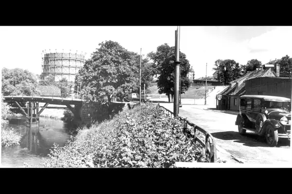 Akerselva med Grünerbrua. Oslo lysverkers store gassklokke på Kuba. Bil på vei inn Nedre gate (Packard?) fra Nordre gate. Det enetasjes trehuset, Nedre gate 2, markerte den nordvestre enden av forstaden Ny York. Fløy mot begge gater og vindusarker på kvisten. Bak ses Grünerhagen.