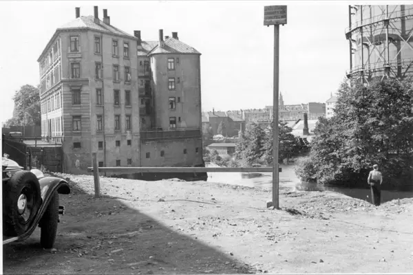 Hjørnet Bergverksgata/Marselis' gate retning sydvest. Oslo Lysverkers store gassklokke på Kuba til høyre. Bygården (leiegårdskompleks) til venstre er Marselis' gate 26 (gården i elva). Bilen til venstre, en Packard? Skiltet på stolpen: "Det er strengt forbudt å henlegge fyll her".