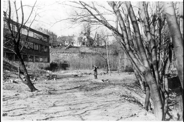 Parkarbeider i gang med opparbeidelse av parkbelte og turvei nordover langs Akerselvas Vestre bredd, mot Schultzehaugen i bakgrunnen med hovedbygningen og bestyrerboligen godt synlig. Oslo Lysverkers transformatorverksted og lager til venstre.