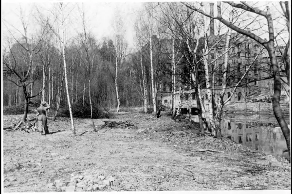 Parkarbeider i gang med opparbeidelse av parkbelte og turvei langs Akerselvas Vestre bredd, nordover fra Oslo Lysverkers transformatorverksted og lager. Christiania Seildugsfabrikks (Seilduksfabrikken) industrianlegg mot og helt inntil østre bredd.