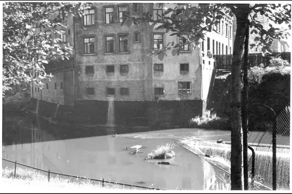 Akerselva ved Nedre Foss (Elvas siste vannfall/foss). Bygården (leiegårdskompleks) i billedet er Marselis' gate 26 (gården i elva) et trefløyet anlegg i fire etasjer og med to underetasjer mot og helt inntil elva. Østre elvebredd. Bak plankegjerdet, Grüner gate.