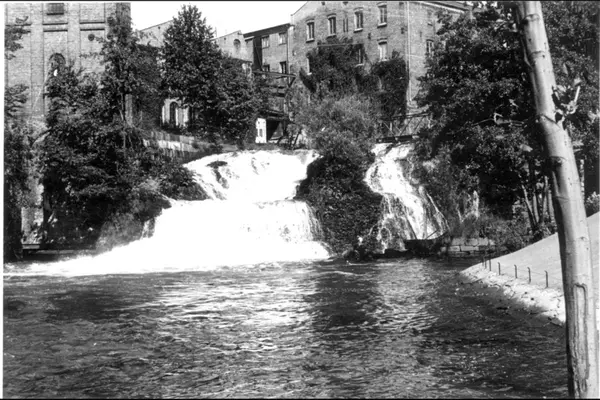Akerselva nord for Beierbrua ved Vøyenfallene. Øvre fossefall med Hjula Veveri (Væveri). Gangbru fra tekstilfabrikken til Glads mølle (bak trærne). Parkbelte ved elva nedenfor Sandakerveien (Sagene skole/bad).