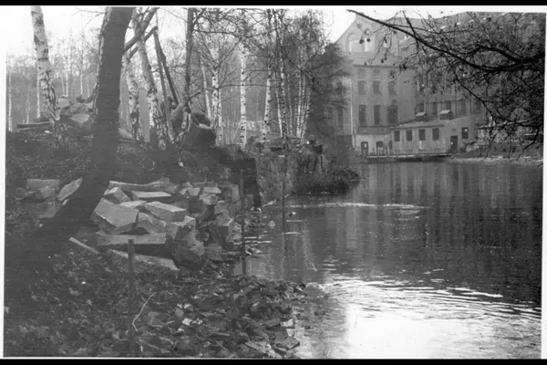 Arbeidere i gang med steinlegging av Akerselvas vestre bredd retning nordover ved Shultzehaugen.Til høyre ses Christiania Seildugsfabrikk (Seilduksfabrikken).