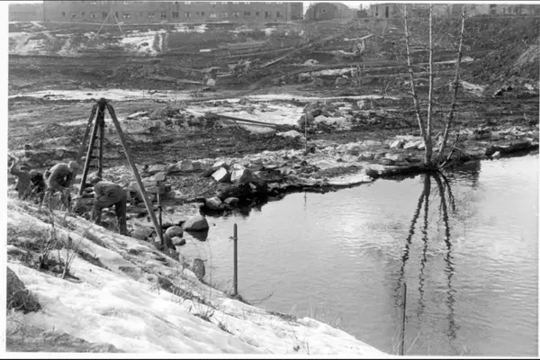 Arbeidere i gang med opparbeidelse av parkanlegg og steinlegging av Akerselvas vestre bredd. Parkbelte mellom Treschows bru og Badebakken. Løftebukk for stein.