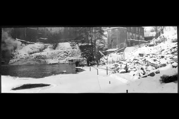 Vinter ved Akerselva nedenfor Øvre Vøyenfossen. Glads mølle (Nedre Papirmølle), med turbinhuset i front, til høyre fra midten av billedet. Graahs spinneri oppe til venstre. Arbeidere i gang med forbredelse til steinlegging av elvas østre elvebredd. Sammensatt bilde.