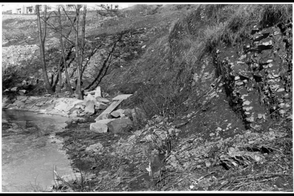 Delvis steinlagt elvebredd, med flat naturstein, langs Akerselvas østre bredd nord for Beierbrua. Parkbelte i sin begynnelsesfase. Blokkbebyggelsen i øvre billedkant er Sameiet i Sandakerveien 10 B.