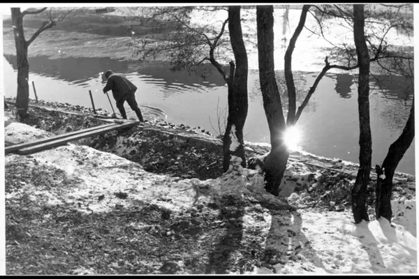 Arbeider med spett legger flat naturstein på plass langs Akerselvas bredd. Grøft for kloakkrør i trase langs elvebredden (slutt på å bruke elva som kloakk).