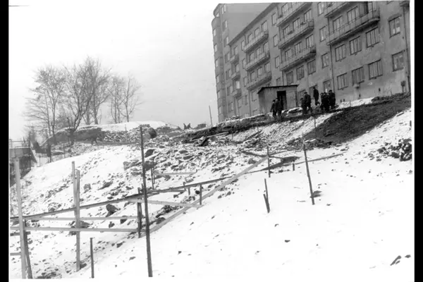 Opparbeidelse til parkområde på østsiden av Akerselva nordover fra Beierbrua mot Marcus Thranes gate. Verktøybrakke og arbeidere. Utstikkelse til turveier. Blokkbebyggelsen er Sameiet i Sandakerveien 10 B Vinterstid.
